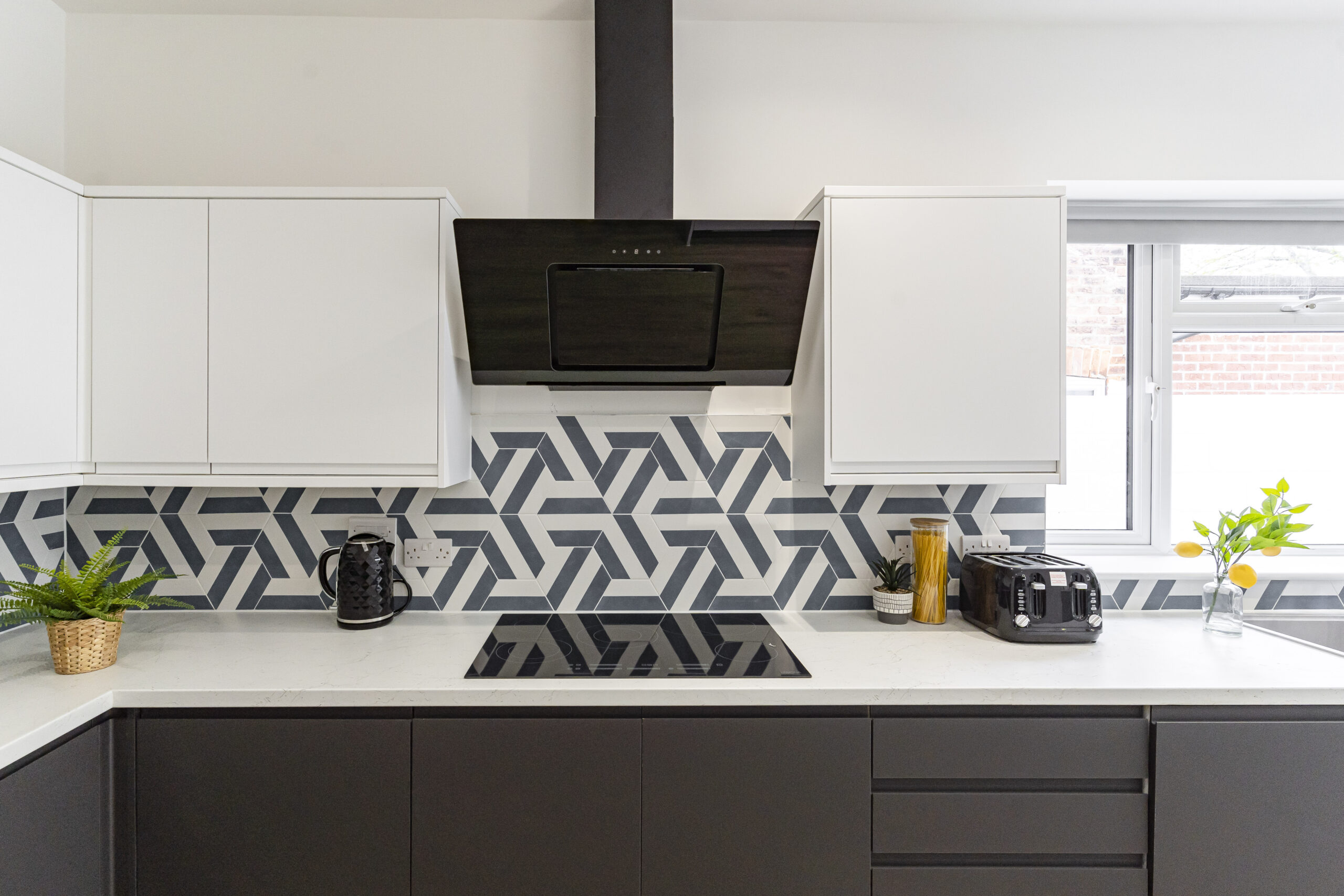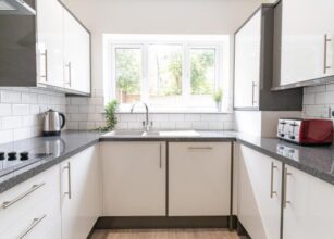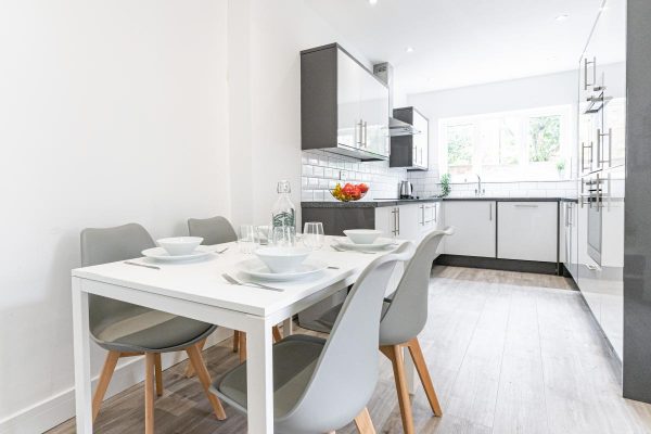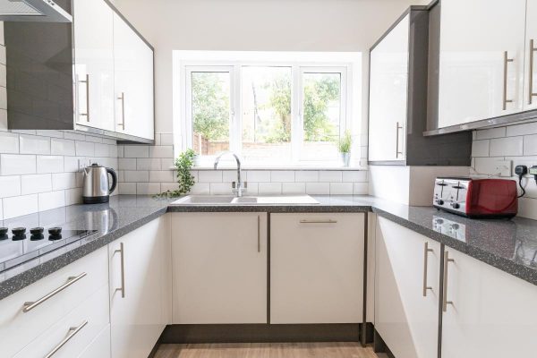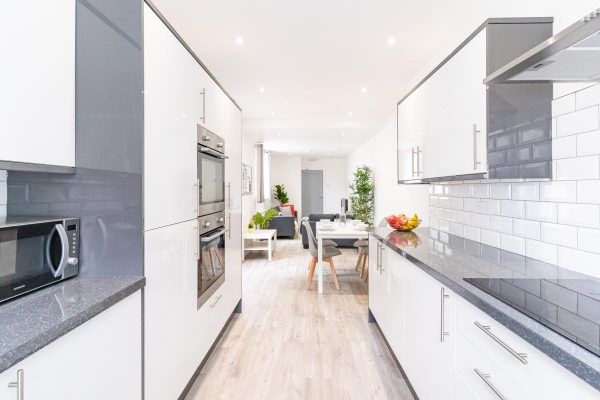 • A large, modern open-plan kitchen with individual cupboards for personal food storage