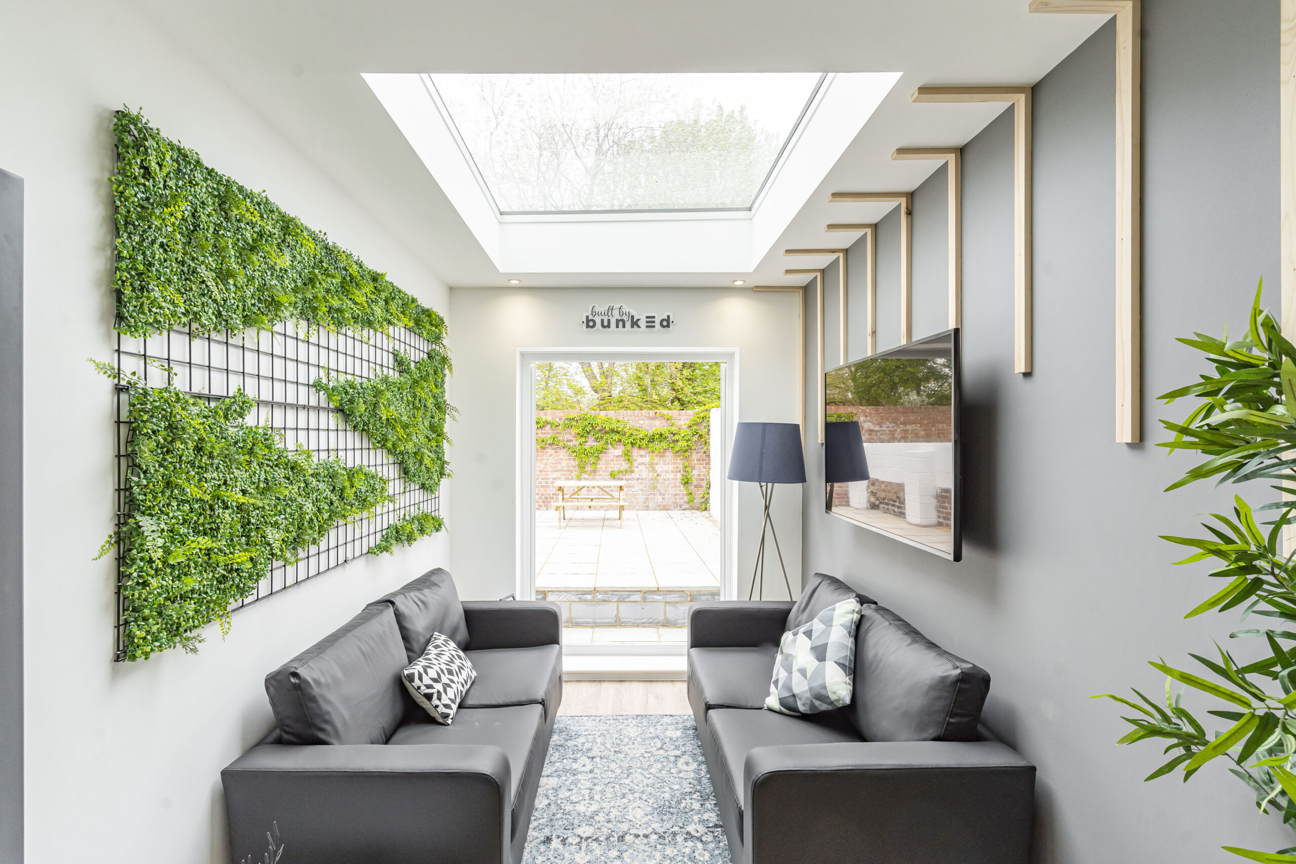 • A bright and welcoming lounge with sofas, a TV, and gaming system.